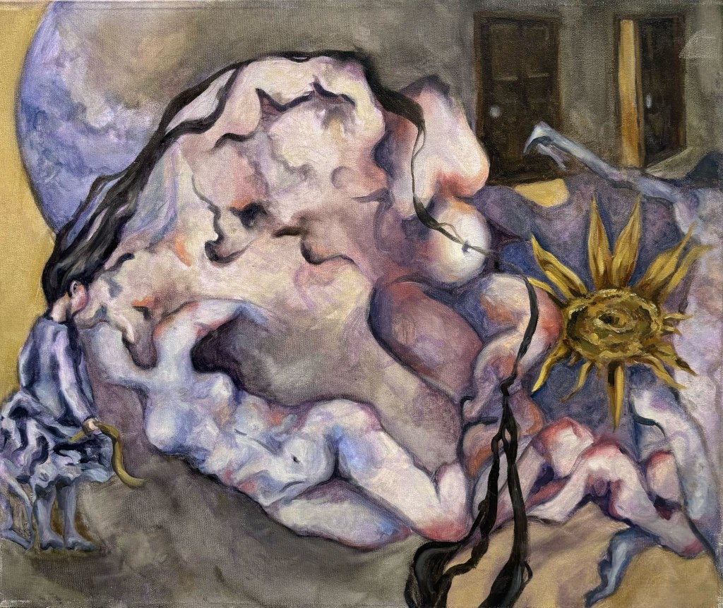 Anachronisms (Dorothea Tanning), 2025. Oil on canvas, 18 x 24″